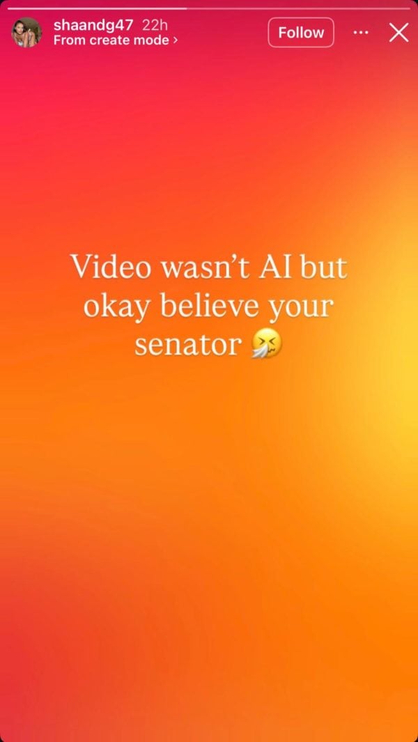 Dagama, however, directly challenged that position. In a post on her Instagram story, she rejected the claim that the video was generated using artificial intelligence, writing sarcastically: “Video wasn’t AI but okay believe your senator,” accompanied by a smiling emoji.